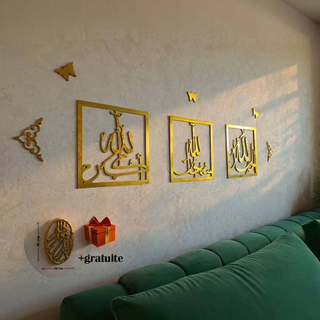 مجموعة مكونة من 8 قطع سورة الاخلاص ذهبية اللون 100/30 سنتمتر + البسملة 30/20 سنتمتر + صدق الله العظيم 20/10 سنتمتر + فراشات + قطعتين مزخرفتين على الجانبين +🎁 هدية من متجرنا -لوحة بسم الله-