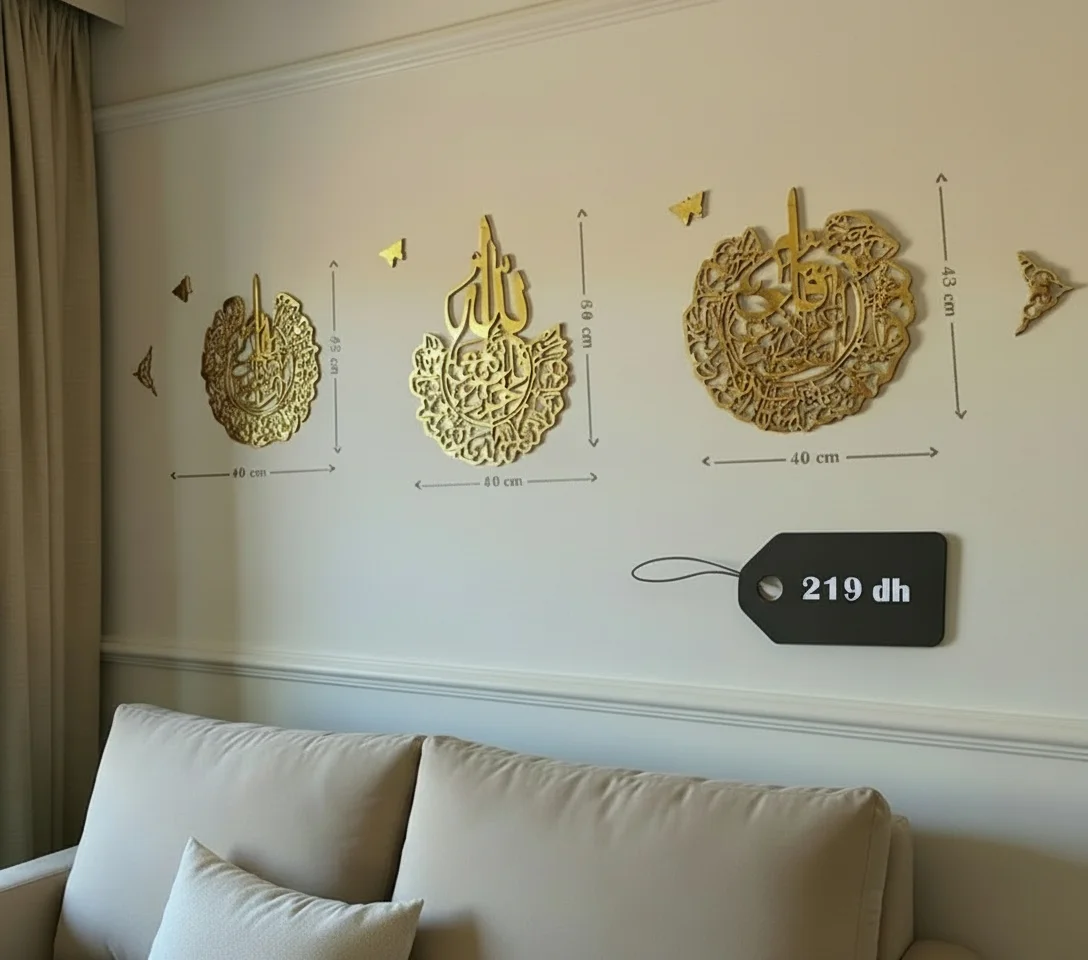 مجموعة مكونة من 8 قطع سورة الاخلاص ذهبية اللون 100/30 سنتمتر + البسملة 30/20 سنتمتر + صدق الله العظيم 20/10 سنتمتر + فراشات + قطعتين مزخرفتين على الجانبين +🎁 هدية من متجرنا -لوحة بسم الله-